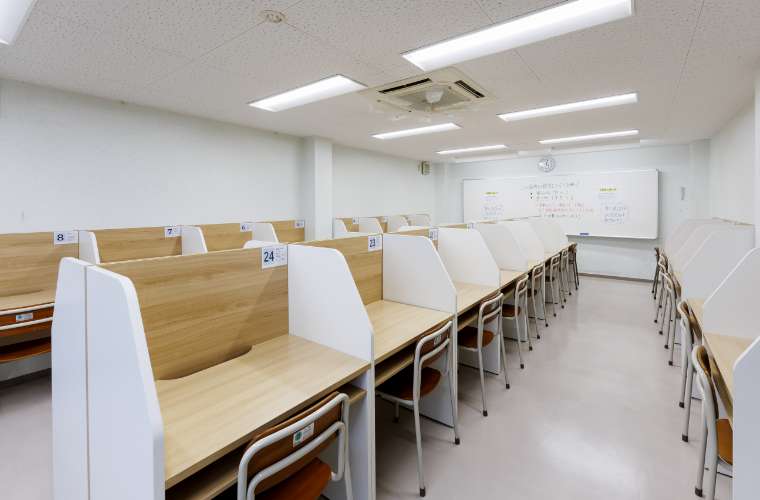 自習室は平日・土日も午後3時~夜11時まで使用可能。一人ひとりの席が仕切られているので周りを気にせず学習できます。全30席。1階101教室横に食事をとれるスペースがあります。